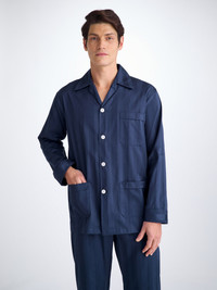 Our classic fit men's pyjamas are designed for comfort, offering a relaxed style that is perfect for lounging day to night. They feature a three pocket jacket, classic collar and adjustable two-button waistband. Elasticated sides on the trousers mean the front and back are flat for your comfort. Customise your pyjama set with your initials for a unique personalised touch. The Lingfield is a mid-weight 100% cotton with a luxury twofold yarn in the satin for luxurious comfort and softness all night long. It's designed to last a lifetime and retains its colour and shape excellently... we won't blame you for living in these for years to come! T o make it truly special, we can personalis e your garment. We offer a range of options including monogramming, motifs, and secret messages. Read more about our personalised services here . The model is 6'2" / 189cm tall with waist size 31.9” / 81cm, chest size 37.8” / 96cm. He wears a size Medium. PRODUCT DETAILS Material: Pure Cotton Fabric Weight: Medium Fabric Type: Satin Gender: Men's Colour: Navy Pattern: Stripe Sleeve Length: Long Sleeve Season: CLA Country of Origin: Czech Republic Composition: 100% Cotton Fit: Relaxed Fit Item Number: 5000-LING001NAV
