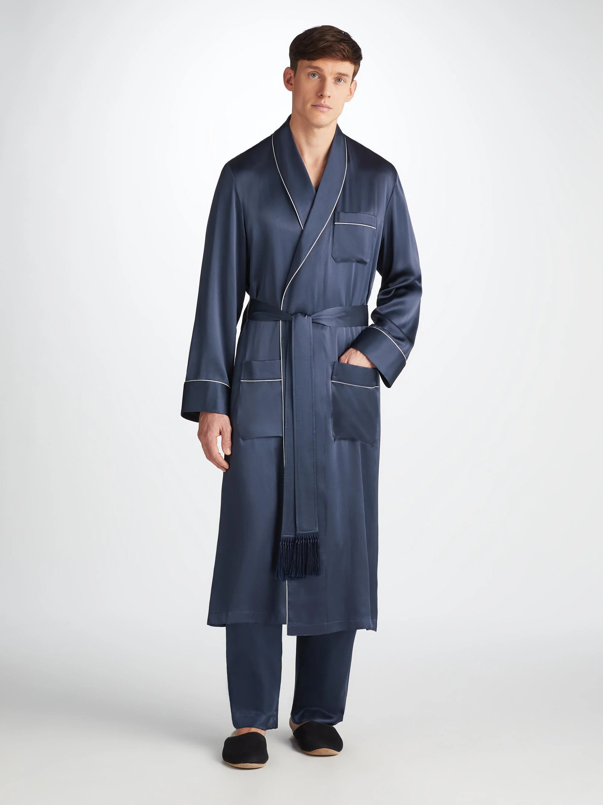 Cut by hand to ensure we uphold the supremely soft and elegant satin finish, the Derek Rose dressing gown features a classic, generous cut and length, for both elegance and comfort. Made to a specification first developed by Mr Derek Rose decades ago and refined over the years, the gown features a traditional shawl collar, rifle cuffs and breast and side pockets and merges classic styling with luxurious Mulberry silk. Handmade in our workshop in Cheshire, England, the Bailey navy tasselled belt dressing gown is produced in extremely limited quantities. The result of hours of loving craftwork by our skilled pattern cutters and seamstresses, you're sure to feel like royalty when relaxing at home in this silk robe. This garment has also been fully piped by hand in a complementary white silk piping and finished with a navy tasselled belt for an added touch of luxe. The model is 6'2" / 189cm tall with waist size 31.5” / 80cm, chest size 38” / 97cm. He wears a size Medium. Click here for our full range of Men’s Dressing Gowns. PRODUCT DETAILS MATERIAL: Pure Silk FABRIC WEIGHT: Light FABRIC TYPE: Regular GENDER: Men's COLOUR: Navy PATTERN: Plain SEASON: 22-W COUNTRY OF ORIGIN: United Kingdom COMPOSITION: 100% Silk FIT: Regular Fit ITEM NUMBER: 5535-BAIL001NAV