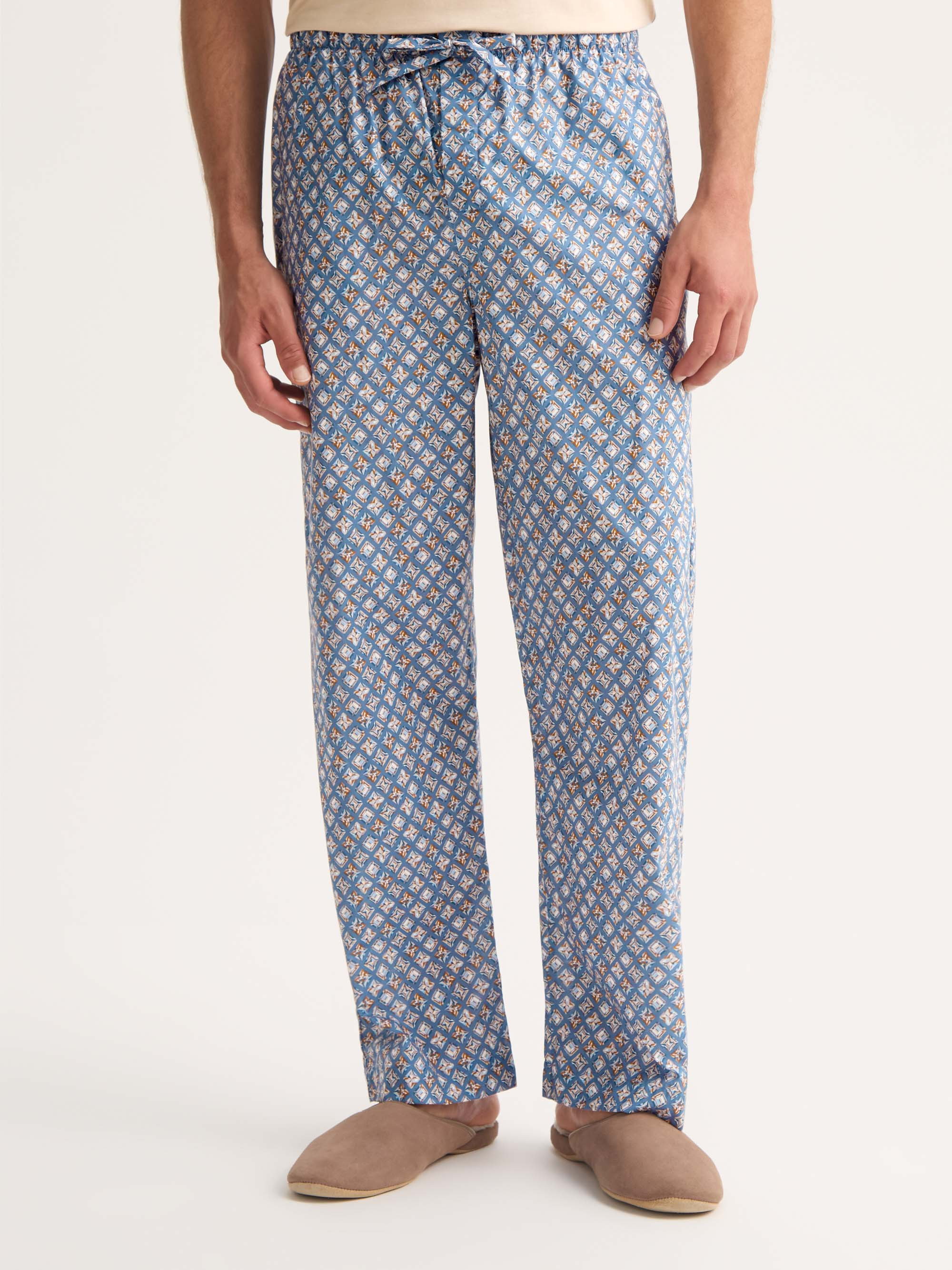 Lightweight softness with year-round comfort Made from soft, lightweight cotton batiste, these lounge trousers are designed for comfort in every season. The multicolour diamond print adds a subtle touch of style to a relaxed fit. They feature an elastic and self-fabric tie waistband, two side pockets, a rear patch pocket and a concealed magnetic fly for everyday practicality. Perfect for home, weekends or holidays, these trousers are an effortless loungewear essential. Model is 6’1” / 188cm, wearing a size Medium. PRODUCT DETAILS Material: Pure Cotton Fabric Weight: Light Fabric Type: Regular Gender: Men's Colour: Blue Multi Pattern: Print Season: 26-S Country of Origin: Czech Republic Composition: 100% Cotton Fit: Regular Fit Item Number: 3564-LEDB091MUL