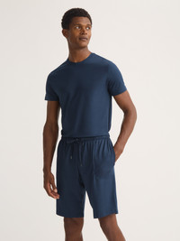 We believe by focusing on the small details we can help you feel noticeably more comfortable when switching off and relaxing at home. Our Basel jersey shorts in navy are a testament to this and offer a combined elastic and tie waistband for the perfect fit. They also feature two front side pockets and a rear back pocket to keep your phone and essentials close while you're lounging. Both comfortable and flattering, we've elevated this loungewear short into a luxury essential for the modern man. Our Basel fabric has to be touched to be believed. It offers long-lasting softness and doesn't pill, making it able to withstand countless days of lounging and even a duvet day (or two). The micro modal fabric constantly reacts to your body and helps you stay cool or warm according to your temperature. Clever. Furthermore, this special fabric is also environmentally friendly; made from sustainably forested European beech trees. The durability and quality of it also means you’ll be wearing your lounge shorts for years to come! The model is 6'2" / 189cm tall with waist size 31.5” / 80cm, chest size 38” / 97cm. He wears a size Medium. PRODUCT DETAILS MATERIAL: Micro Modal Stretch FABRIC WEIGHT: Medium FABRIC TYPE: Jersey GENDER: Men's COLOUR: Navy PATTERN: Plain SEASON: CLA COUNTRY OF ORIGIN: Czech Republic COMPOSITION: 95% Modal 5% Elastane FIT: Regular Fit ITEM NUMBER: 3559-BASE001NAV