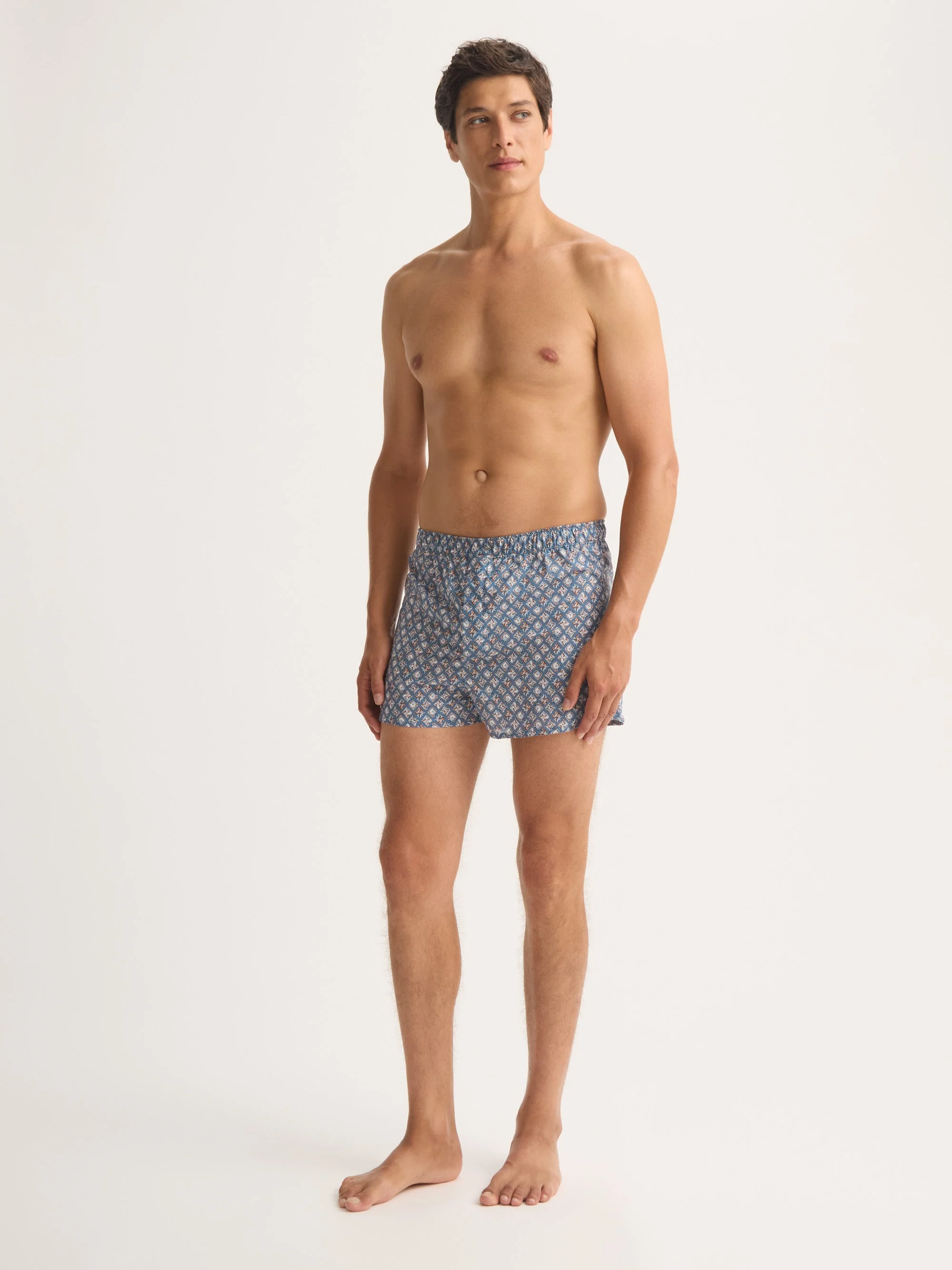 A refined fit with a bold, celebratory print. Marking our centennial, these multicolor blue boxer shorts feature a geometric diamond motif print — a playful, energetic take on a timeless symbol of celebration. Cut in a modern fit, they offer a slimmer, streamlined shape while maintaining complete comfort. The reworked design removes excess fabric from the back panel, using a flat fell centre seam to minimize skin contact and reduce irritation. Details include an elasticated waistband, curved leg seams and side vents for ease of movement and lasting durability. The innovative self-seeking, magnetic fly ensures effortless, secure fastening. Crafted from lightweight cotton batiste, they are soft, breathable and designed for year-round comfort. Model is 6’0” / 183cm, wearing a size Medium. PRODUCT DETAILS Composition: 100% Cotton Fabric Weight: Light Pattern: Print Country of Origin: Czech Republic Item Number: 6050-LEDB091MUL