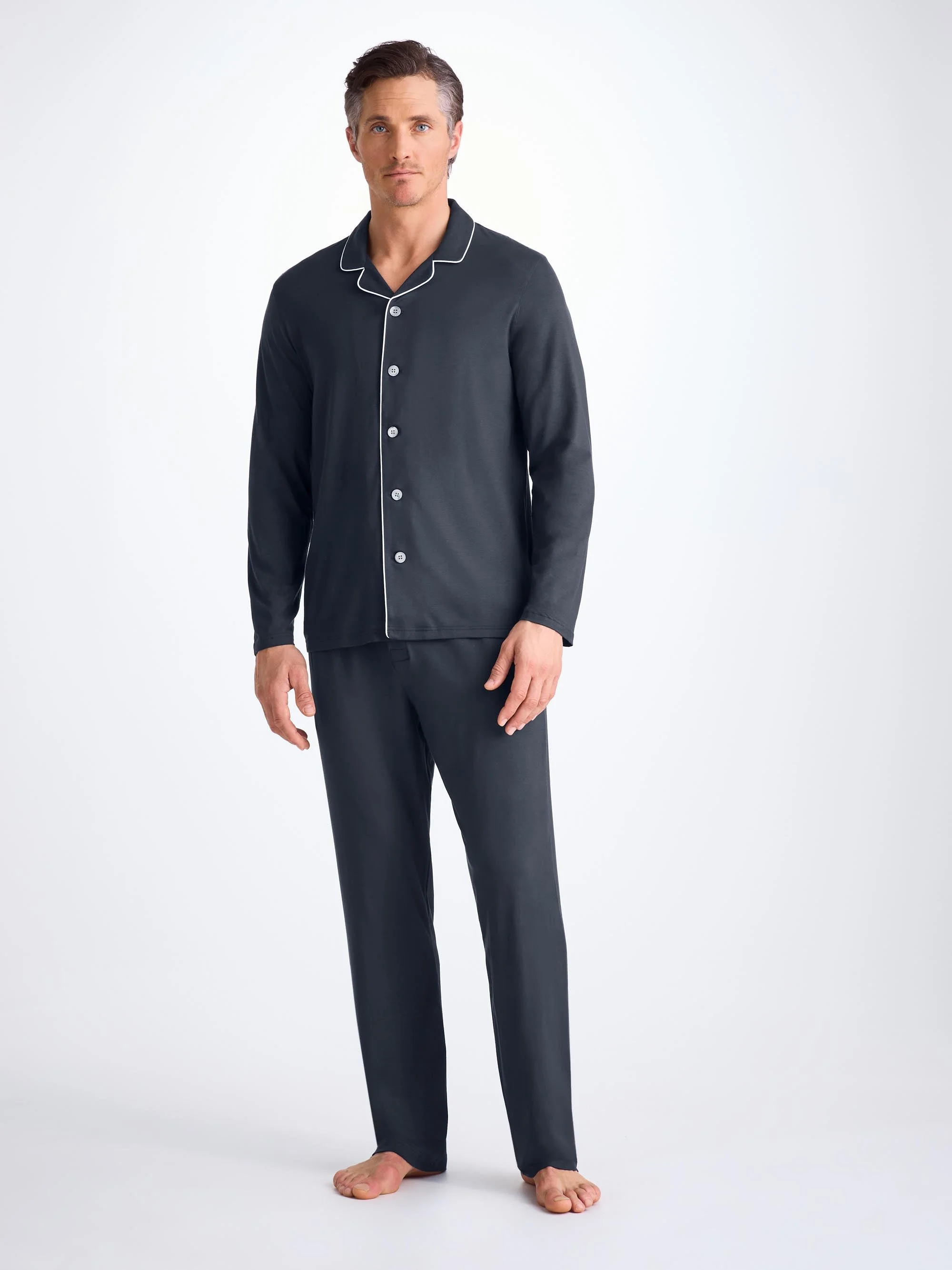 Luxury comfort in timeless navy Crafted from our signature micro modal stretch, the men's Basel pyjamas are designed for supreme softness, breathability and year-round comfort. Naturally temperature-regulating, the fabric adapts to your body to keep you cool or warm as needed. The pyjama top is finished with white piping, a flat open collar and imitation mother-of-pearl buttons, while the trousers feature our self-seeking magnetic fly closure for effortless practicality. Cut in a classic fit, this set is as refined as it is comfortable. The Basel fabric is sustainably crafted from European beech trees using a carbon-neutral process. Durable, colour-last and resistant to pilling, it retains its luxurious softness and rich evergreen tone wash after wash. Perfect for evening relaxation, travel, or elevating your nightly routine, these pyjamas redefine modern loungewear. Add a personal touch by customising your chosen piece with a monogram, motif, or secret message. Model is 6’3” / 190cm, wearing a size Medium. PRODUCT DETAILS Composition: 95% Modal 5% Elastane Fabric Weight: Medium Pattern: Plain Sleeve Length: Long Sleeve Country of Origin: Czech Republic Item Number: 4070-BASE001NAV