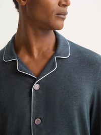 Our men's jersey Marlowe anthracite grey pyjamas have been designed for a streamlined look by removing the trouser drawcord and creating a half-flat front with an elasticated back and sides of the trousers. This prevents bunching of the waistband fabric at the front. The Marlowe trousers also feature our self-seeking magnetic fly closure. A hidden blessing to every man, this simple but revolutionary feature allows easy opening and hassle-free closure of the fly. To finish the refined look, the jacket has white piping, a flat and open collar and mother of pearl buttons throughout. Made from a unique blend of micro modal stretch, our specially developed Marlowe fabric is ultra-soft and doesn't pill, making it able to withstand countless days of lounging and plenty of sleep-filled nights. Not only is the Marlowe soft, but thermostatic properties in the micro modal fibres allow them to react to changes in temperature and regulate your body heat. What's more, the fabric retains its initial softness and is also environmentally friendly; made from sustainably forested European beech trees using a process that is carbon neutral. To make it truly special, we can personalise your garment with initials or a motif. Read more about our personalised service here . The model is 6'2" / 189cm tall . H e wears a size Medium. PRODUCT DETAILS Composition: 95% Modal 5% Elastane Fabric Weight: Medium Pattern: Plain Sleeve Length: Long Sleeve Country of Origin: Czech Republic Item Number: 4070-MARL001ANT