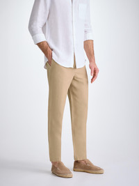 Our Sydney trousers are cut for a regular fit with a slight taper at the ankle for the perfect, warm weather ready style. Featuring a curved back yoke for a great fit and an elasticated waistband with a drawcord for comfort. The front of the trousers feature two angled side pockets whilst the back features a single zipped pocket that sits under the curve of the back yoke. This pocket is closed with our unique pin-lock zip which locks into place when flat to ensure a secure closure. A zipped fly opening and our minimalist rose logo label on the front left pocket finish the look. We have developed a mid-weight, beautifully soft and breathable pure linen that will keep you cool and comfortable in even the hottest of conditions. Made in Italy, this fabric is finished by being piece-dyed before construction for a neutral camel tone. Unlike other linens, ours isn't itchy or scratchy, so they're perfect for wearing from the villa to the beach, the pool or as a cool, smart-casual trouser for sultry evening walks and dinner by the sea. The model is 6’1” / 188cm tall. He wears a size Medium. PRODUCT DETAILS Material: Pure Linen Fabric Weight: Medium Fabric Type: Regular Gender: Men's Colour: Camel Pattern: Plain Season: 26-S Country of Origin: Czech Republic Composition: 100% Linen Fit: Regular Fit Item Number: 9800-SYDN002SAN