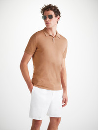 Jacob is not your average short sleeve polo shirt. Jacob is a lightweight Sea Island Cotton knit, grown and spun in the West Indies before being knitted and garment dyed in Europe. Sea Island Cotton fibres are cultivated exclusively on the West Indies Islands in the Caribbean where the tropical climate produces what are considered the most luxurious cotton fibres in the world. Sea Island Cotton comes from the seed of the Gossypium Barbadense plant which produces the longest fibres in the world with pile lengths of more than 50mm. Genuine Sea Island Cotton is the rarest type of cotton, making up less than 0.0004 percent of the world’s cotton production. The West Indian Sea Island Cotton Association (WISICA) inspects and certifies every kilogram of locally produced cotton and the hologram on our swing tag is a sign of 100% authentic Sea Island Cotton. The Jacob is an incredibly durable garment. The fabric is considered the strongest naturally grown cotton in the world which means it will resist wear and last a lifetime. The definition of a luxurious investment. The fabric also has an unrivalled softness as the long staple yarns create a smooth and silky surface. This is not cotton as you know it. Featuring a ribbed collar, mother of pearl buttons, knitted back neck tape to minimise stretching and tubular knit hem and cuffs, the devil really is in the detail with our Jacob collection. Designed to sit in our lounge and leisurewear collections, this smart polo can withstand heavy-duty relaxing, sport, holidays, informal and sophisticated events alike and generally every way you enjoy your free-time. The Jacob, seen here in camel, is perfect layered under other pieces, but honestly, you won't want to cover up this beauty. The model is 6’1” / 188cm tall. He wears a size Medium. PRODUCT DETAILS Material: Sea Island Cotton Fabric Weight: Light Fabric Type: Regular Gender: Men's Colour: Camel Pattern: Plain Sleeve Length: Short Sleeve Season: 25-W Country of Origin: Portugal Composition: 100% Cotton Fit: Regular Fit Item Number: 9850-JACO001CAM