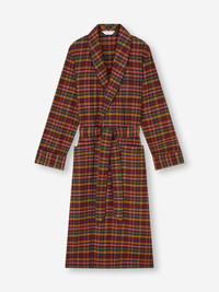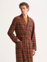 Classic check in supremely soft brushed cotton. The men's Kelburn multicolor check is a seasonal design featuring festive tones of red and gold, perfect for cozy winter evenings. Cut to a relaxed, midi length, this robe features a shawl collar, mitred belt, internal ties and three patch pockets, including a chest pocket ready for monogramming. Fully piped throughout, it blends timeless tailoring with easy comfort. Made from our signature winter-weight brushed cotton, the fabric is warm, breathable and incredibly soft. A unique brushing technique ensures a smooth handle that feels indulgent yet lightweight—ideal for layering over pajamas or loungewear. A refined addition to your at-home wardrobe, this robe is made for comfort, warmth and seasonal style. Add a personal touch with monogramming or a motif. Model is 5’10.5” / 179cm, wearing a size Small. PRODUCT DETAILS Composition: 100% Cotton Fabric Weight: Heavy Pattern: Check Sleeve Length: Long Sleeve Country of Origin: Czech Republic Item Number: 5505-KELB049MUL