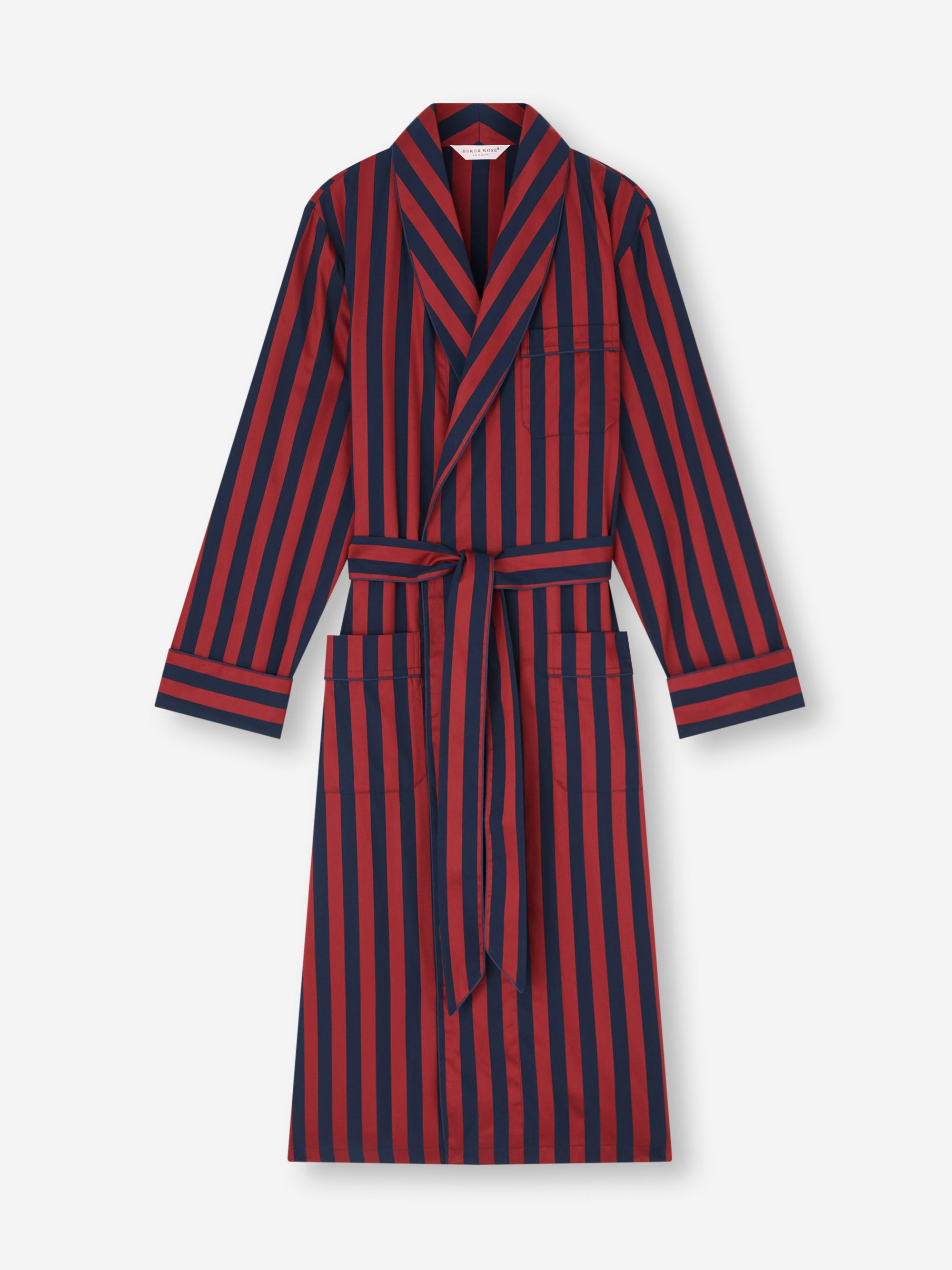 Classic elegance for effortless lounging A timeless essential for refined relaxation, our Royal Cotton robe in navy and red stripe offers the perfect balance of luxury and comfort. Designed in a regular fit, it features a classic shawl collar, chest pocket, and two front patch pockets — ideal for keeping essentials close at hand. Crafted from our signature mid-weight 100% Royal cotton, the fabric is woven from luxury twofold yarns for exceptional softness and durability. Its satin stripe construction provides a smooth, lustrous finish, while the breathable cotton ensures year-round comfort. Finished with white piping, a tasseled belt, and a centre back length of 134cm, this gown combines timeless tailoring with everyday ease. Personalise your gown with initials or a motif for a truly unique touch. Model is 6’0” / 183cm tall, wearing a size Medium. PRODUCT DETAILS Composition: 100% Cotton Fabric Weight: Medium Pattern: Stripe Sleeve Length: Long Sleeve Country of Origin: Czech Republic Item Number: 5505-ROYA225NAV
