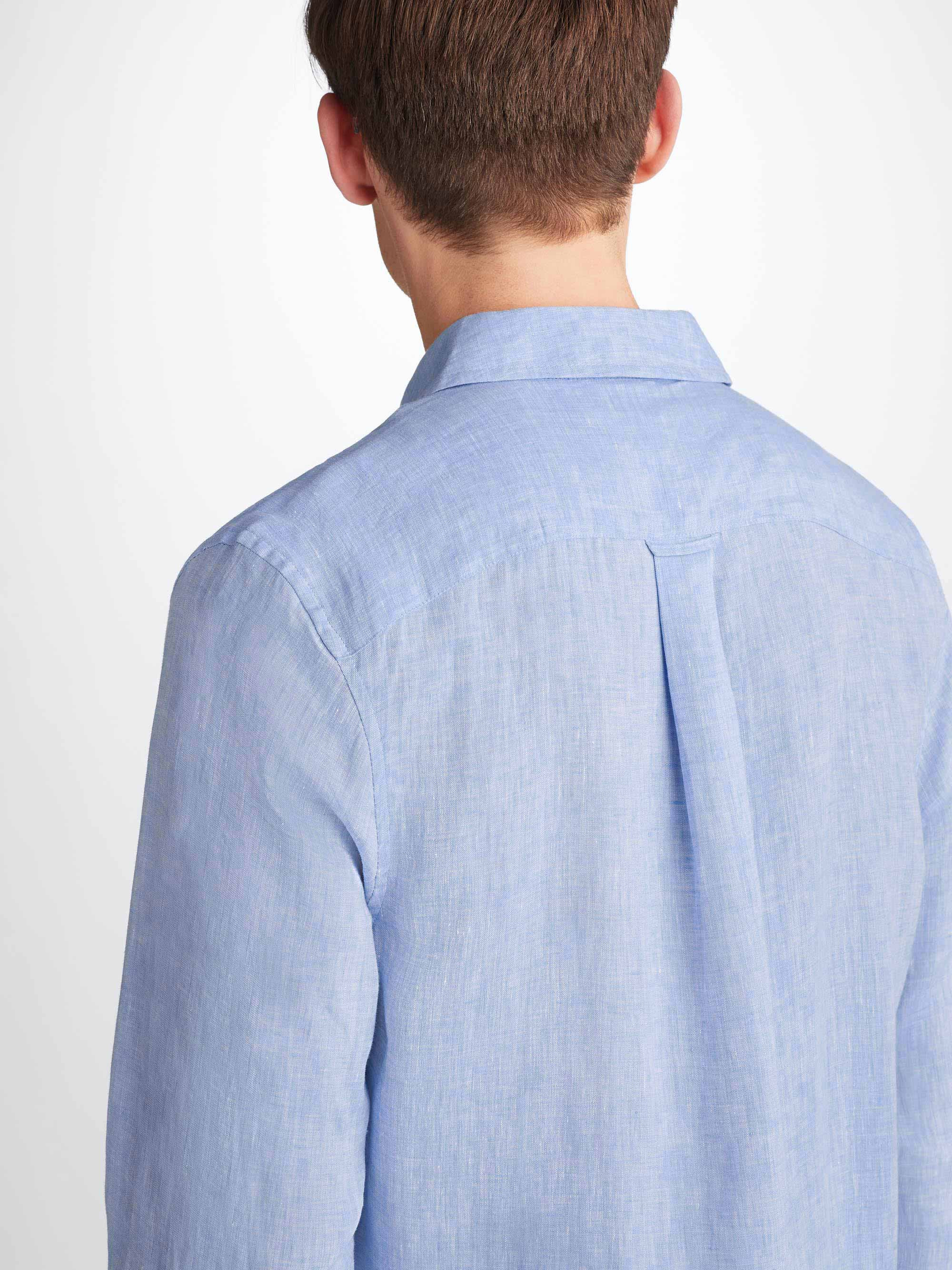The Monaco shirt features a curved back yoke with a box-pleat for comfort and a curved hem with side vents for ease of movement. We've used the classic styling of a button-through front and cuffs, a 2-piece collar and for a modern addition, we've added a U-shaped breast pocket with a handy sunglass loop for effortless summer chic. For a final touch of luxe, the shirt is finished with mother of pearl buttons throughout and our minimalist rose logo label at the hem. There's also a handy 'locker' loop on the back for you to hang your shirt up when changing. We have developed a lightweight, beautifully soft and breathable pure linen that will keep you cool and comfortable in even the hottest of conditions. This Italian fabric is dyed at the yarn stage for an eventual two-tone melange effect when the threads are combined together. The model is 6' 1 " / 18 5 cm tall with waist size 3 1 ” / 79 cm, chest size 38 ” / 9 6 cm. He wears a size Medium . PRODUCT DETAILS Material: Pure Linen Fabric Weight: Light Fabric Type: Regular Gender: Men's Colour: Light Blue Pattern: Plain Sleeve Length: Long Sleeve Season: CLA Country of Origin: Czech Republic Composition: 100% Linen Fit: Regular Fit Item Number: 9820-MONA001BLU