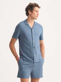 Supremely soft, breathable and designed for year-round comfort. Our men's Basel short pyjamas in a timeless storm blue are crafted from our signature micro modal stretch, offering unparalleled softness and a naturally breathable feel against the skin. With temperature-regulating fibres that adapt to your body, they keep you cool in the heat and warm when it’s cooler—making them perfect for year-round wear. The pyjama top features white piping, a flat open collar and mother-of-pearl buttons for a refined finish. The matching shorts include a self-seeking magnetic fly for effortless ease, alongside a relaxed cut for comfort. Sustainably made from European beech trees in a carbon-neutral process, the Basel fabric retains its colour, shape and silky softness wash after wash, ensuring lasting quality. Ideal for relaxed evenings, weekend lounging or warm-weather sleeping, these pyjamas are a modern sleepwear essential. Model is 6’0” / 183cm, wearing a size Medium. PRODUCT DETAILS Composition: 95% Modal 5% Elastane Fabric Weight: Medium Pattern: Plain Sleeve Length: Short Sleeve Country of Origin: Czech Republic Item Number: 4090-BASE022BLU