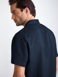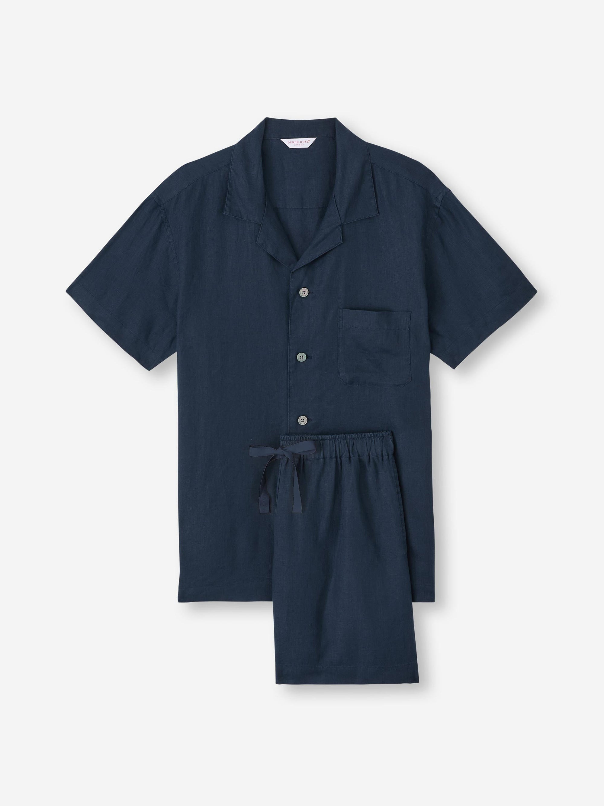 Breathe easy this summer with our Sicily navy men’s short pyjamas, crafted from 100% pure linen. Lightweight, naturally breathable, and thermo-regulating, they’re designed to keep you cool and comfortable during warm nights and lazy mornings. Cut in a relaxed fit with short sleeves and a soft drawstring waistband, these linen pyjamas offer easy movement and effortless style—perfect for summer lounging, sleeping, or even a sunny morning coffee on the balcony. Thoughtful details include: A classic camp collar Single chest pocket Side seam pockets Curved back yoke Elasticated waistband with adjustable drawstring Linen becomes softer and stronger with every wash, so you can enjoy these pyjamas season after season. The model is 6’1” / 188cm tall. He wears a size Medium. PRODUCT DETAILS Material: Pure Linen Fabric Weight: Light Fabric Type: Regular Gender: Men's Colour: Navy Pattern: Plain Sleeve Length: Short Sleeve Season: 25-W Country of Origin: Lithuania Composition: 100% Linen Fit: Regular Fit Item Number: 5188-SICI001NAV