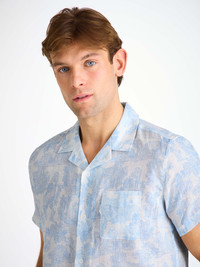 The Milan 26 shirt combines details like a curved back yoke with a box-pleat, made for comfort with a curved hem with side vents for ease of movement. Our hand drawn island hopping print in white and blue is a modern interpretation of a toile de Jouy. Filled with tropical trees and plan life, it features a tropical bird flying in-between the islands. We've used the classic styling of a button-through front and cuffs, a 2-piece collar and for a modern addition, we've added a U-shaped breast pocket with a handy sunglass loop for effortless summer chic. We have developed a lightweight, beautifully soft and breathable pure linen that will keep you cool and comfortable in even the hottest of conditions. Made in Italy, this fabric is dyed at the yarn stage for an eventual two-tone melange effect when the threads are combined together. The model is 6’2’’ / 188.5cm tall. He wears a size Medium. PRODUCT DETAILS Material: Pure Linen Fabric Weight: Light Fabric Type: Regular Gender: Men's Colour: White Pattern: Print Sleeve Length: Short Sleeve Season: 25-W Country of Origin: Czech Republic Composition: 100% Linen Fit: Regular Fit Item Number: 9825-MILA026WHI