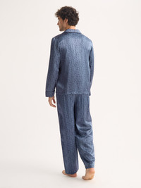 Contemporary Elegance in Pure Silk Crafted from our exclusive seasonal silk stripe, these men's pajamas combine classic navy tones with a sophisticated menswear-inspired design. Digitally printed on the finest silk, the fabric offers a silky-smooth finish that feels as luxurious as it looks. Designed with a contemporary cut, the pajama top sits closer to the body without being tight. It features a revere collar, mother-of-pearl button-front closure, a piped chest pocket, and dark navy silk piping throughout for a refined finish. The trousers mirror the pajama top detailing, with side pockets, an elastic waist for comfort, and our patented self-seeking magnetic fly closure for effortless ease. Lightweight, elegant and supremely soft, these silk pajamas are the ultimate expression of modern luxury. Add a personal touch with monogramming, a motif or a secret message. Model is 6'3" / 190 cm, wearing a size Medium. PRODUCT DETAILS Composition: 100% Silk Fabric Weight: Light Pattern: Print Sleeve Length: Long Sleeve Country of Origin: United Kingdom Item Number: 5085-BRIN124NAV