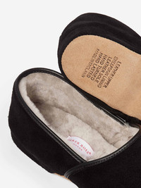 At the end of a hard day's work or on a cold winter's morning, is there anything better than slipping your feet into cosy sheepskin slippers that look as good as they feel? The Crawford slippers are the perfect addition to your pyjamas or loungewear, for head-to-toe feel-good comfort. The Crawford features a soft cow suede outer that feels great to the touch. Matching the quality of the outer, the interior features a sheepskin lining and cushioned footbed that your feet will thank you for. The sole is made from soft suede meaning you can glide around in comfort in the morning without waking the family. The slippers are finished with a black leather trim for an added touch of luxe. With over 80 years of experience making sheepskin and leather footwear, our slippers are made at a family-owned workshop in England. Each slipper can take up to 4 weeks to make, using only the finest locally sourced sheepskin and cow suede available. PRODUCT DETAILS MATERIAL: Wool/Sheepskin FABRIC WEIGHT: N/A FABRIC TYPE: Regular GENDER: Men's COLOUR: Black PATTERN: Plain SEASON: CON COUNTRY OF ORIGIN: United Kingdom COMPOSITION: Suede Out (Cow) Sheepskin In FIT: Regular Fit ITEM NUMBER: 0500-CRAW001BLA