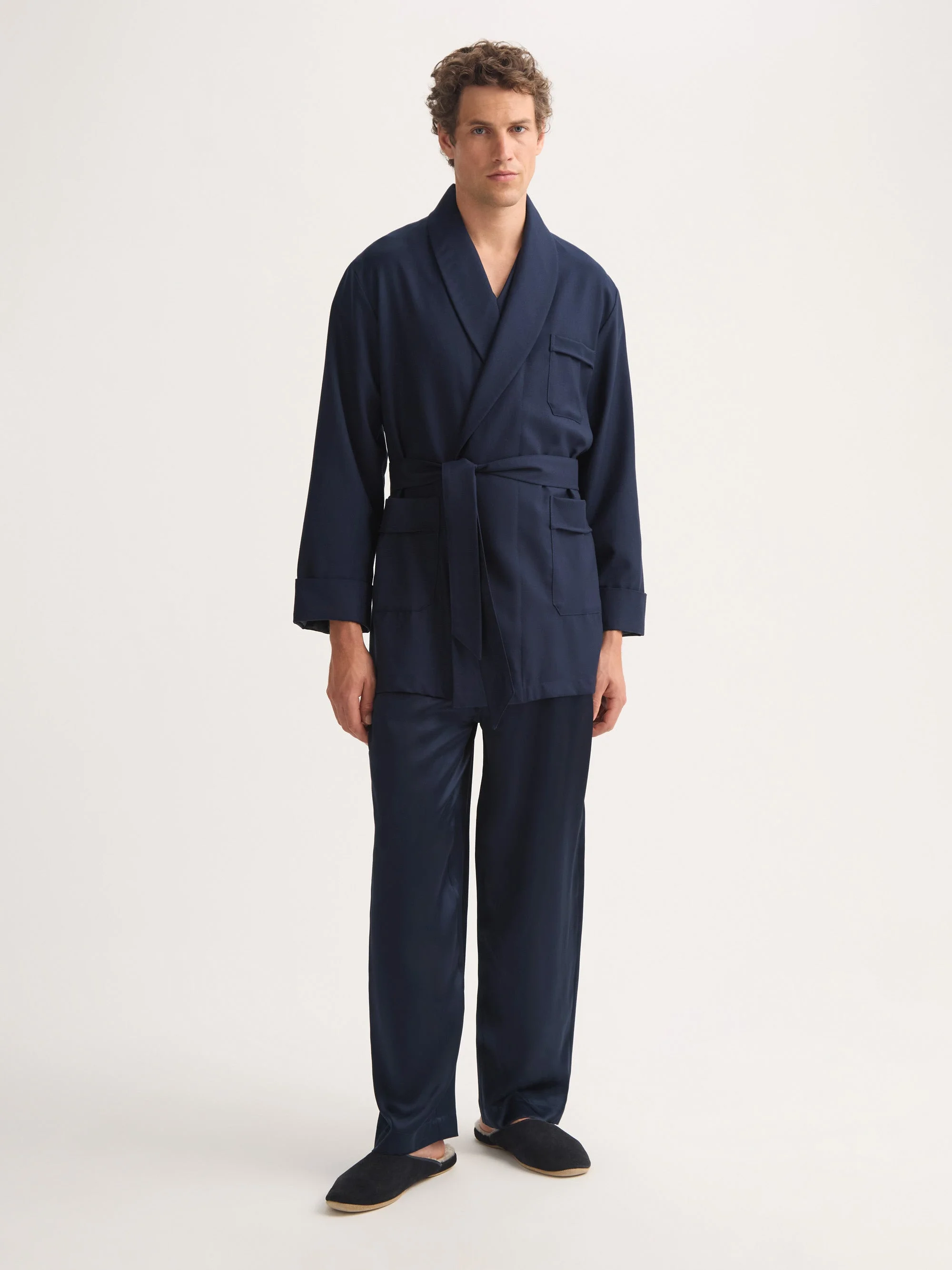 From its practical beginnings as a protective garment, shielding clothes and companions from the smell of smoke, to its revered place at the height of extravagant loungewear, the smoking jacket has evolved to become synonymous with gentlemanly style. Our take on the smoking jacket draws inspiration from its history while keeping a modern finish with a minimalist cut. Made from a fine grade of worsted wool that ensures warmth, comfort and durability without being heavy or bulky, the Westminster 2 is a must-have for the colder months. Finished with a shawl collar, traditional turn-back cuffs, breast pocket and two side pockets, the jacket is closed with a matching self fabric belt and is fully lined to easily slip on and off. An essential for any gentleman, the smoking jacket has a relaxed fit and is light enough to be worn over a pair of pyjamas or a trouser and t-shirt combo, for a comfortable way to lounge in style. Every fabric from Derek Rose is created in-house in our London design studio, and the Westminster is no different. In this case, a classic navy features on pure wool base for a sartorial taste of British design. The model is 6’1” / 188cm tall. He wears a size Mediu m. PRODUCT DETAILS Composition: 100% Wool Fabric Weight: Medium Pattern: Plain Sleeve Length: Long Sleeve Country of Origin: Czech Republic Item Number: 5550-WEST002NAV