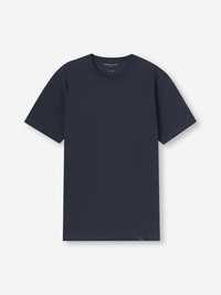 Designed in a fabric exclusive to Derek Rose, Barny is our brand new everyday wear t-shirt. Knitted in the EU, our mid weight Pima cotton t-shirt is not only breathable, but hypoallergenic. An excellent choice for any occasion. Created in a casual relaxed fit, the crew neckline features a bound collar with detailed ribbing. We have chosen to print our label inside of the neckline for optimal comfort. With twin needle cuffs and hem, our Barny t-shirt, seen here in navy, is made for every adventure due to its durable finish. Pair with your trousers or shorts of choice for a capsule wardrobe essential. To make it truly special, we can personalise your garment with initials or a motif. Read more about our personalised service here . The model is 6’1” / 188cm tall with waist size 32” / 82cm, chest size 38” / 99cm. He wears a size Mediu m. PRODUCT DETAILS Material: Pure Cotton Fabric Weight: Medium Fabric Type: Jersey Gender: Men's Colour: Navy Pattern: Plain Sleeve Length: Short Sleeve Season: 24-W Neck Shape: Crew Neck Country of Origin: Portugal Composition: 100% Cotton Fit: Regular Fit Item Number: 3175-BARN002NAV