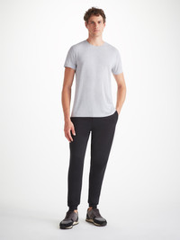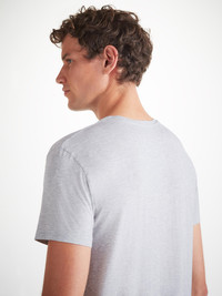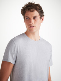 Easy-to-wear and detailed with a classic crew neck and a streamlined shape that is both comfortable and flattering, we've elevated this loungewear t-shirt into a luxury essential. We've cut it to a comfortable regular fit, so it's ideal as a base layer or worn solo with denim or lounge shorts. Our silver Ethan quality combines a subtle marl with the stretchy softness of a blend of micro modal and elastane that feels and looks fantastic. Originated from a desire to make a lighter-weight version of our signature Basel micro modal fabric which is crafted from a unique blend of micro modal stretch; made from sustainably forested European beech trees using a process that is environmentally friendly and carbon neutral. We maintained the super-soft fabric quality and stretch composition and added a subtle yarn mix to add delicate ripples of tone for a fresh and modern aesthetic. It offers long-lasting softness and will withstand countless days of lounging. Not only is the Ethan soft, but thermostatic properties in the micro modal fibres allow them to react to changes in temperature and regulate your body heat, making it ideal for keeping you cool in high temperatures and warm in low temperatures. For a solid colour alternative, try our Basel t-shirts. The model is 6'2" / 189cm tall with waist size 31.5” / 80cm, chest size 38” / 97cm. He wears a size Medium. PRODUCT DETAILS MATERIAL: Micro Modal Stretch FABRIC WEIGHT: Light FABRIC TYPE: Jersey GENDER: Men's COLOUR: Silver PATTERN: Plain SLEEVE LENGTH: Short Sleeve SEASON: CLA NECK SHAPE: Crew Neck COUNTRY OF ORIGIN: Czech Republic COMPOSITION: 91% Modal 9% Elastane FIT: Regular Fit ITEM NUMBER: 3048-ETHA001SIL