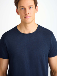 Our Jordan t-shirt needs to be touched to be believed. Jordan is an exceptionally soft pure linen jersey; this is like no other linen shirt you own. A fabric that typically comes with that rough feeling, our Jordan is cut from a super-soft and lightweight pure linen, knitted with a very fine yarn and finished with a soft wash. All this creates supernatural softness. Designed to sit in our resort collection, the Jordan is a holiday and hot climate essential. Linen is a natural fibre that comes from the flax plant and boasts characteristics perfect for warmer climates. Linen can absorb up to 20% of its weight in moisture causing it to draw perspiration away from the body. Linen is also fast-drying; the fibres release moisture back into the air very quickly and dry almost instantly because the fibre itself cannot hold air or heat. The Jordan is very breathable as the fibres allow heat to pass through easily; perfect for those welcome gusts of sea breeze on a warm day. Finally, linen is famous for its durability. Washing linen makes it stronger and softer and the tensile strength increases when wet. What can't linen do? The details have been kept minimal for a clean finish and exceptional comfort. Seen here in navy, the bound neckline helps minimise stretching and the t-shirt has a slightly relaxed cut for a modern fit. The model is 6'1" / 185cm tall with waist size 31” / 79cm, chest size 38” / 96cm. He wears a size Medium. PRODUCT DETAILS Material: Pure Linen Fabric Weight: Light Fabric Type: Regular Gender: Men's Colour: Navy Pattern: Plain Sleeve Length: Short Sleeve Season: CLA Neck Shape: Crew Neck Country of Origin: Portugal Composition: 100% Linen Fit: Relaxed Fit Item Number: 3163-JORD002NAV