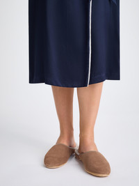 Entirely handmade in England, the Imogen features a soft cowhide suede outer that feels great to the touch. Matching the quality of the outer, the interior features a super soft sheepskin lining and cushioned footbed. The sole is made from soft suede meaning you can glide around in comfort in the morning without waking the family. The slippers are finished with a beige leather trim for an added touch of luxe. Look forward to getting up in the morning with our Imogen suede and sheepskin lined mule slippers for women. Trust us, your feet will thank you! PRODUCT DETAILS Material: Wool/Sheepskin Fabric Weight: N/A Fabric Type: Regular Gender: Women's Colour: Camel Pattern: Plain Season: 24-W Country of Origin: United Kingdom Composition: Suede Out (Cow) Sheepskin In Fit: Regular Fit Item Number: 0900-IMOG001CAM