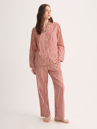 Classic Comfort with a Soft Feminine Touch Designed for sleep, lounging and laid-back mornings, our Capri pajamas feature a part-satin woven stripe in peach and red — a vibrant yet elegant combination that brings a fresh feel to classic nightwear. Cut from our signature lightweight cotton batiste, these pajamas are breathable, soft and smooth against the skin — perfect for staying cool in warmer months while offering year-round comfort. The button-front pajama top features a revere collar, single chest pocket and full white piping for a refined finish. The matching trousers have an elastic waist with a self-fabric drawstring, side pockets and a relaxed fit that drapes beautifully for easy movement and all-night comfort. Add a personal touch with monogramming, a motif or a secret message. Model is 5'10.5" / 179 cm tall, wearing a size Small. PRODUCT DETAILS Composition: 100% Cotton Fabric Weight: Light Pattern: Stripe Sleeve Length: Long Sleeve Country of Origin: Czech Republic Item Number: 2012-CAPR026RED
