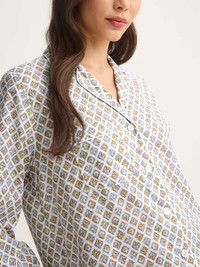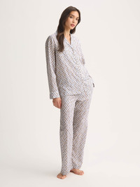 Lightweight luxury for easy lounging and restful sleep. Crafted from our signature cotton batiste, these pajamas are soft, breathable and wonderfully light—perfect for thermo-regulation all year round. The white and neutral diamond print designed in our London studio adds a subtle touch of timeless style. The pajama top features a piped trim, patch pocket and imitation mother-of-pearl button-up front. The pants include an elasticated, higher waist with self-fabric drawstring for an adjustable fit, a slightly longer leg length and practical side pockets for everyday comfort. Easy to wear, easy to pack and easy to love, this set is a staple for lounging or sleeping in comfortable style. Add a personal touch with monogramming, a motif or a secret message—learn more about our personalization services. Model is 5’10.5” / 179cm, wearing a size Small. PRODUCT DETAILS Composition: 100% Cotton Fabric Weight: Light Pattern: Print Sleeve Length: Long Sleeve Country of Origin: Czech Republic Item Number: 2012-LEDB091WHI