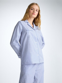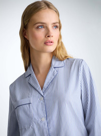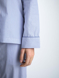 Classic and versatile. The James is a lightweight and breathable pure cotton fabric with a blue and white striped design. It's made to offer the highest level of comfort and relaxation all year round. Designed for your free time with a relaxed fit, the James pyjama set is perfect for a peaceful nights sleep. Featuring a three pocket jacket, classic collar and elasticated waist trouser with draw string detail. To make it truly special, we can personalise your garment. We offer a range of options including monogramming, motifs, and secret messages. Read more about our personalised services here . Create a coordinated family look with our Amalfi Cotton Batiste pyjamas for kids and men . The model is 5’9.5” / 176cm. She wears a size Small. PRODUCT DETAILS Composition: 100% Cotton Fabric Weight: Light Pattern: Stripe Sleeve Length: Long Sleeve Country of Origin: Czech Republic Item Number: 2012-JAME001BLU