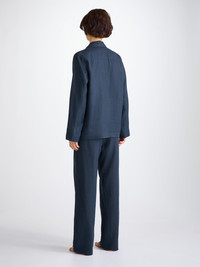 Made for warm climates, our brand new linen pyjama set in navy takes a modern approach to the classic pyjama. Designed with a lightweight fabric, our 100% linen becomes softer and more durable with each wear. Featuring a relaxed fit, this pyjama is complete with a chest pocket, elasticated waistband, and curved back yoke. Finished with side seam pockets; relax in our naturally breathable pyjama set for a cool nights sleep. The model is 5’9.5” / 177cm tall . She wears a size Small. PRODUCT DETAILS Material: Pure Linen Fabric Weight: Light Fabric Type: Regular Gender: Women's Colour: Navy Pattern: Plain Sleeve Length: Long Sleeve Season: 25-W Country of Origin: Lithuania Composition: 100% Linen Fit: Regular Fit Item Number: 2053-SICI001NAV