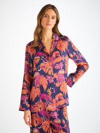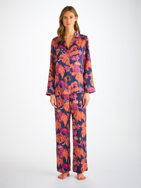 Embellished with a hand drawn jungle birds pattern, this design features a mixture of tropical birds and luscious jungle flowers. Find a flamingo, parrot and a toucan sitting amongst vibrant plumery, bird of paradise blooms and colourful monstera leaves. Produced in extremely limited quantities and the result of hours of loving craftwork by our skilled seamstresses in our Cheshire, England silk studio, this luxury lilac pyjama set is delicately crafted to ensure we maintain the supremely soft and smooth satin finish. It's the little things in life that make all the difference. That's why we've obsessed over the details on this silk PJ. The jacket is fully piped in complementary dark navy and the chest pocket has mitred corners. The trousers also have a matching flat silk drawstring and elasticated waist for comfort. To make it truly special, we can personalise your garment. We offer a range of options including monogramming, motifs, and secret messages. Read more about our personalised services here . The model is 5’10” / 178cm tal l . She wears a size Small. PRODUCT DETAILS Material: Pure Silk Fabric Weight: Light Fabric Type: Regular Gender: Women's Colour: Navy Pattern: Print Sleeve Length: Long Sleeve Season: 25-W Country of Origin: United Kingdom Composition: 100% Silk Fit: Regular Fit Item Number: 2050-BRIN122NAV