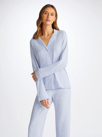 Combining a comfortable yet flattering shape with intricate details, our Ethan blue women's pyjamas will keep you looking great and feeling comfortable throughout the seasons. The jacket top features a fully piped finish in a contrasting white piping for a stylish appearance and the trousers have an elasticated and drawstring waist for practicality. The trousers also have a higher waist for a more natural fit and improved comfort, and the most important addition? Pockets! It's almost hard to believe how gorgeously soft our Ethan fabric is. This lightweight fabric is crafted from a unique blend of micro modal stretch. Made sustainably from European beech tree pulp (yes, trees!) using a process that is environmentally friendly and carbon neutral, the fabric has a super-soft quality. We mix two different yarn colours to create a delicate two-tone marled effect for a fresh and modern aesthetic. For block colours try our Lara pyjamas . Not only is the Ethan soft, but thermostatic properties in the micro modal fibres allow them to react to changes in temperature and regulate your body heat, making this luxe pyjama set ideal for keeping you cool in high temperatures and warm in low temperatures. The model is 5' 10" / 178cm tall with waist size 24” / 61cm, bust size 29.1” / 74cm. She wears a size Small. PRODUCT DETAILS MATERIAL: Micro Modal Stretch FABRIC WEIGHT: Light FABRIC TYPE: Jersey GENDER: Women's COLOUR: Blue PATTERN: Plain SLEEVE LENGTH: Long Sleeve SEASON: CON COUNTRY OF ORIGIN: Czech Republic COMPOSITION: 91% Modal 9% Elastane FIT: Regular Fit ITEM NUMBER: 2034-ETHA001BLU