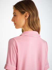 Designed for a flattering but comfortable shape, our women's shortie pyjamas in ballet pink will keep you looking great and feeling comfortable throughout the seasons. The short-sleeve jacket top features a fully piped finish in contrasting white piping for a stylish appearance and the shorts have piped cuffs with an elasticated and drawstring waist for practicality. The Lara also has a higher waist for a more natural fit and improved comfort, and the most important addition? Pockets! Lara originated from a desire to make a lighter weight but equally soft version of our signature Basel fabric. It really is a customer favourite. Not only is the Lara soft, but thermostatic properties in the micro modal fibres allow them to react to changes in temperature and regulate your body heat, making this pyjama perfect to sleep in. What's more, the Lara fabric retains its initial softness and colour and is also environmentally friendly; made from sustainably forested European beech trees using a process that is carbon neutral. To make it truly special, we can personalise your garment with initials or a motif. Read more about our personalised services here . The model is 5’10” / 178cm tal l . She wears a size Small. PRODUCT DETAILS Material: Micro Modal Stretch Fabric Weight: Medium Fabric Type: Jersey Gender: Women's Colour: Ballet Pink Pattern: Plain Sleeve Length: Short Sleeve Season: CLA Country of Origin: Czech Republic Composition: 95% Modal 5% Elastane Fit: Regular Fit Item Number: 2036-LARA009PIN