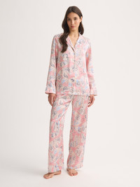 Pure silk elegance with timeless detailing. Inspired by rose gardens, this women's pajama set features a kaleidoscope of hand-drawn butterflies swirling across a colored ground. The delicate linear design captures the same textured style as our rose print, reimagined in a vibrant, playful palette. Crafted from 100% silk and produced in extremely limited quantities at our Cheshire silk studio, each set is delicately handmade to preserve the fabric’s supremely soft and smooth satin finish. Designed in a regular fit, the fully piped pajama top includes a revere collar, button-through front and mitred chest pocket, finished with an ivory piping for contrast. The matching pants feature an elasticated waistband and flat silk drawstring for comfort. Luxurious and elegant, these silk pajamas are made to elevate your evenings and ensure indulgent, restful nights. Add a personal touch with monogramming, a motif or a secret message. Model is 5’9.5” / 176cm, wearing a size Small. PRODUCT DETAILS Composition: 100% Silk Fabric Weight: Light Pattern: Print Sleeve Length: Long Sleeve Country of Origin: United Kingdom Item Number: 2050-BRIN126PIN