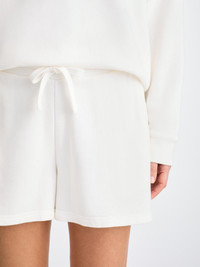 Seen here in white, our Quinn sweat shorts ensure all-day-long comfort. Featuring a combined elastic and tie waistband, our sweats also feature two front side pockets and a zipped back pocket to keep your phone and essentials close whilst you're out and about. Stylish, yet practical. The Quinn fabric combines all the key qualities of our cotton and micro modal; it's durable and has great colour retention, meaning it can withstand long-lasting wear and won't fade in colour. It's thermoregulating, making it perfect for warm days or cosy evenings in and it's breathable, so it's excellent for exercise. But perhaps most importantly, it's forever soft, seriously - you won't believe the quality. The model is 5’9.5” / 177cm tall . She wears a size Small. PRODUCT DETAILS Material: Cotton/Micro Modal Fabric Weight: Medium Fabric Type: Jersey Gender: Women's Colour: White Pattern: Plain Season: 25-W Country of Origin: Portugal Composition: 68% Cotton 32% Modal Fit: Regular Fit Item Number: 1704-QUIN001WHI