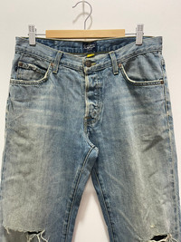 VINTAGE EARL JEAN RIPS WASHED BLUE DISTRESSED DENIM PLEASE READ THE DESCRIPTION!!! DON'T BE SHY TO ASK ANY QUESTION :- WE DO COMBINE SHIPPING. HAPPY SHOPPING WITH US. • Size on tag : 31x34 like fits 30 • Made In : Usa • Materials : refer photo • Measurement : Waist : 15 (30) inches (manual) Outseam : 39 inches Inseam : 29.5 inches Front Rise : 10 inches Back Rise : 15 inches Thigh : 11.5 inches Knee : 9 inches Leg Oppening : 8.5 (17) inches • Condition : Good used condition WORLDWIDE SHIPPING 3-5 days arrive with tracking number • NO REFUND / NO RETRUN Please carefully check the description and the measurements posted for the item you're interested in Take a look at all the photos {defects, tags, etc}. if you have doubts please don't buy. Don't worry about customs tax or fees. I always declare as "GIFT" and put the value item $10 - 40 Please leave your PHONE NUMBER on the note while make a purchase, as the shipping company always need the phone number to help delivering. THANK YOU. dumoh17
