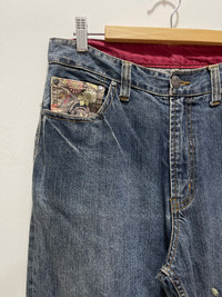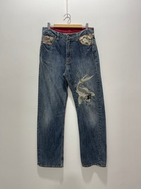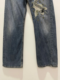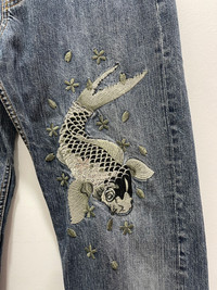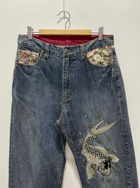 JAPANESE KOI FISH EMBROIDERY DISTRESSED DENIM JEANS PLEASE READ THE DESCRIPTION!!! DON'T BE SHY TO ASK ANY QUESTION :- WE DO COMBINE SHIPPING. HAPPY SHOPPING WITH US. • Size on tag : like fits 30 • Made In : refer photo • Materials : refer photo • Measurement : Waist : 15 (30) inches (manual) Outseam : 44 inches Inseam : 31.5 inches Front Rise : 12 inches Back Rise : 16.5 inches Thigh : 12.5 inches Knee : 9.5 inches Leg Oppening : 9 (18) inches • Condition : Good used condition WORLDWIDE SHIPPING 3-5 days arrive with tracking number • NO REFUND / NO RETRUN Please carefully check the description and the measurements posted for the item you're interested in Take a look at all the photos {defects, tags, etc}. if you have doubts please don't buy. Don't worry about customs tax or fees. I always declare as "GIFT" and put the value item $10 - 40 Please leave your PHONE NUMBER on the note while make a purchase, as the shipping company always need the phone number to help delivering. THANK YOU. dumoh2