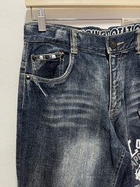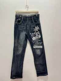 VINTAGE ENGINE ROTATION POEM MOTORCYCLE DISTRESSED JEANS PLEASE READ THE DESCRIPTION!!! DON'T BE SHY TO ASK ANY QUESTION :- WE DO COMBINE SHIPPING. HAPPY SHOPPING WITH US. • Size on tag : like 30 • Made In : China • Materials : Cotton • Measurement : Waist : 15 (30) inches (manual) Outseam : 43 inches Inseam : 33 inches Front Rise : 11 inches Back Rise : 14.5 inches Thigh : 11.5 inches Knee : 8.5 inches Leg Oppening : 8.5 (17) inches • Condition : Good used condition WORLDWIDE SHIPPING 3-5 days arrive with tracking number • NO REFUND / NO RETRUN Please carefully check the description and the measurements posted for the item you're interested in Take a look at all the photos {defects, tags, etc}. if you have doubts please don't buy. Don't worry about customs tax or fees. I always declare as "GIFT" and put the value item $10 - 40 Please leave your PHONE NUMBER on the note while make a purchase, as the shipping company always need the phone number to help delivering. THANK YOU. dumoh35