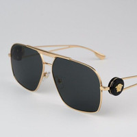 NEW Versace VE2269 100287 Gold Dark Grey Pilot Unisex Sunglasses VE 2269 Brand: Versace Model Number: VE2269 / VE 2269 Color Code: 100287 Gender: Men / Unisex Frame Color: Gold Lens Color: Dark Grey Lens Material: Polyamide Bio Frame Shape: Pilot Frame Style: Full-Rim Frame Material: Metal UV Protection: Category 3 Size: 62X13X130 100% UV Protection! BRAND NEW and 100% AUTHENTIC! Made in Italy. FULL RETAIL VERSACE SET INCLUDES: 1. Glasses 2. Case 3. Cleaning cloth with brand logo 4. Versace booklet 5. Manufacturer care instructions 6. Versace branded box SAME/NEXT day shipping!