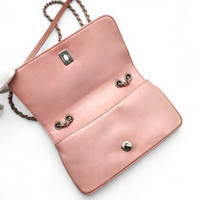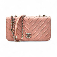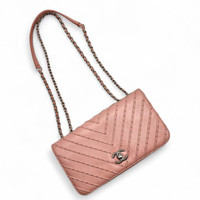Authentic Chanel Flap Bag in pink chevron-quilted leather, embellished with small silver-tone studs. This rare and elegant Chanel piece features the iconic CC turn-lock closure and a versatile leather-interwoven silver-tone chain strap, allowing for crossbody or shoulder wear. A stylish yet practical bag that transitions seamlessly from day to evening. Condition: Great pre-owned condition: * Exterior leather shows minor wear, visible rub marks, particularly along edges and corners. * CC turn-lock hardware does not show major signs of use. * Interior leather flap shows surface marks, and rubbing. * Interior fabric compartment is clean with some faint stains and signs of use. * Serial sticker intact with number: 25781532. * Chain strap in very good condition. Please carefully review all photos provided, as they are part of the item description. Details: * Model: Flap Bag * Material: Calfskin Leather * Color: Pink with silver-tone studs and hardware * Hardware: Silver-tone * Interior: Snap closure, zip pocket, slip pocket, and card slots * Made in Italy * Serial Number: 25781532 (Year 2018-2019) Measurements (Approx.): * Length: 10 in * Height: 6 in * Depth: 2.5 in * Strap Drop: 11 - 20.5 in (crossbody or shoulder wear) A chic and rare Chanel bag for the collector or fashion enthusiast looking for an eye-catching piece with vintage charm and modern versatility.