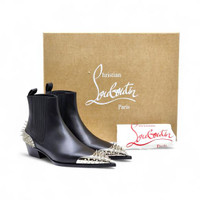 Step into bold luxury with these Christian Louboutin Cheliviss Meteor Leather Chelsea Boots (Style 3240511BK01). Crafted in Italy from premium calf leather, this rare design merges timeless Chelsea structure with Louboutin’s avant-garde edge. The smooth black leather finish is complemented by the brand’s signature red lacquer soles, creating a powerful statement piece for any discerning collector. The Cheliviss Meteor model is known for its refined silhouette and meticulous craftsmanship, offering comfort, balance, and unmistakable Louboutin sophistication. Elastic side panels and a rear pull tab ensure effortless wear, while the polished red sole completes its modern yet iconic character. Features • Christian Louboutin Cheliviss Meteor Leather Chelsea Boots • Style number: 3240511BK01 • EU 42.5 / US 9.5 • 100% calf leather upper • Elastic side panels and rear pull tab • Signature red lacquered sole • Made in Italy • Brand new, never worn, with original box. Minor imperfections as shown. A standout blend of artistry and craftsmanship, the Cheliviss Meteor captures Christian Louboutin’s spirit of innovation — elegant, daring, and meticulously detailed. Perfect for collectors and connoisseurs of fine designer footwear.