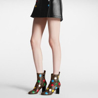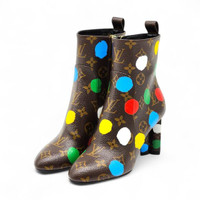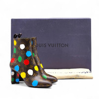 Collector's Item. From LV Staff sales. Marked as UNIFORMES Celebrate the playful universe of Yayoi Kusama with these rare and highly collectible Louis Vuitton ankle boots from the celebrated collaboration. This art-meets-fashion statement piece reimagines the Maison’s iconic Monogram canvas with Kusama’s vibrant, hand-painted-inspired polka dots in striking primary colors. Crafted in Italy, these ankle boots feature the signature rounded toe, a bold sculptural block heel, and gold-tone side zippers for an elegant yet edgy finish. The silhouette is balanced by the meticulous detailing and expert craftsmanship expected from Louis Vuitton. Details: * Monogram coated canvas upper with multicolor Yayoi Kusama dots * Sculptural block heel, approximately 3.5 inches (9 cm) * Iconic flower-shaped rubber inserts on the soles * Side zip closure * Pull tabs for easy slip-on wear * Made in Italy * Louis Vuitton logo embossing under sole * Size EU 36 / US 6 Condition: * Brand new * Unworn soles and flawless heel tips. Includes: * Louis Vuitton box * Louis Vuitton dust bag ---------------------------------------- Collector’s note: A standout creation from the Yayoi Kusama x Louis Vuitton capsule, these boots are more than footwear — they are wearable art. Rarely offered in the resale market in this condition, they are ideal for the collector or fashion connoisseur seeking to own a slice of fashion history.