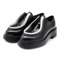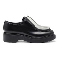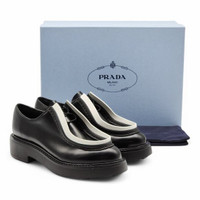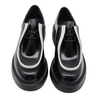 Prada Diapason Opaque Derby Shoes in black brushed leather. Store price: $1250. Size 36.5 (6 US). Leather upper. Rubber bottoms. Made in Italy. Condition: Brand new with box and dustbag. Minor rubbing on the white part as shown in the pictures.