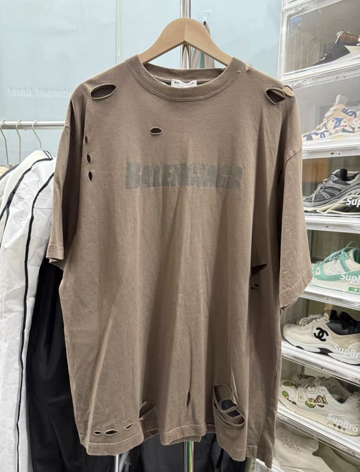 Balenciaga FW22 Distressed Brown T-Shirt Barely used, without defects or signs of wear. Size XS Length 82cm Chest 64cm Authenticity guaranteed. Every item is 100% genuine, carefully inspected, and exactly as shown in the photos. Extra inspection. Each item goes through a second inspection before shipping. Then we pack, ship and upload tracking. Shipping and delivery. Orders are shipped within 6 to 10 business days. Shipping worldwide via DHL, UPS, USPS, FedEx. Enjoy the style, enjoy the experience, and thank you for shopping with Devines.