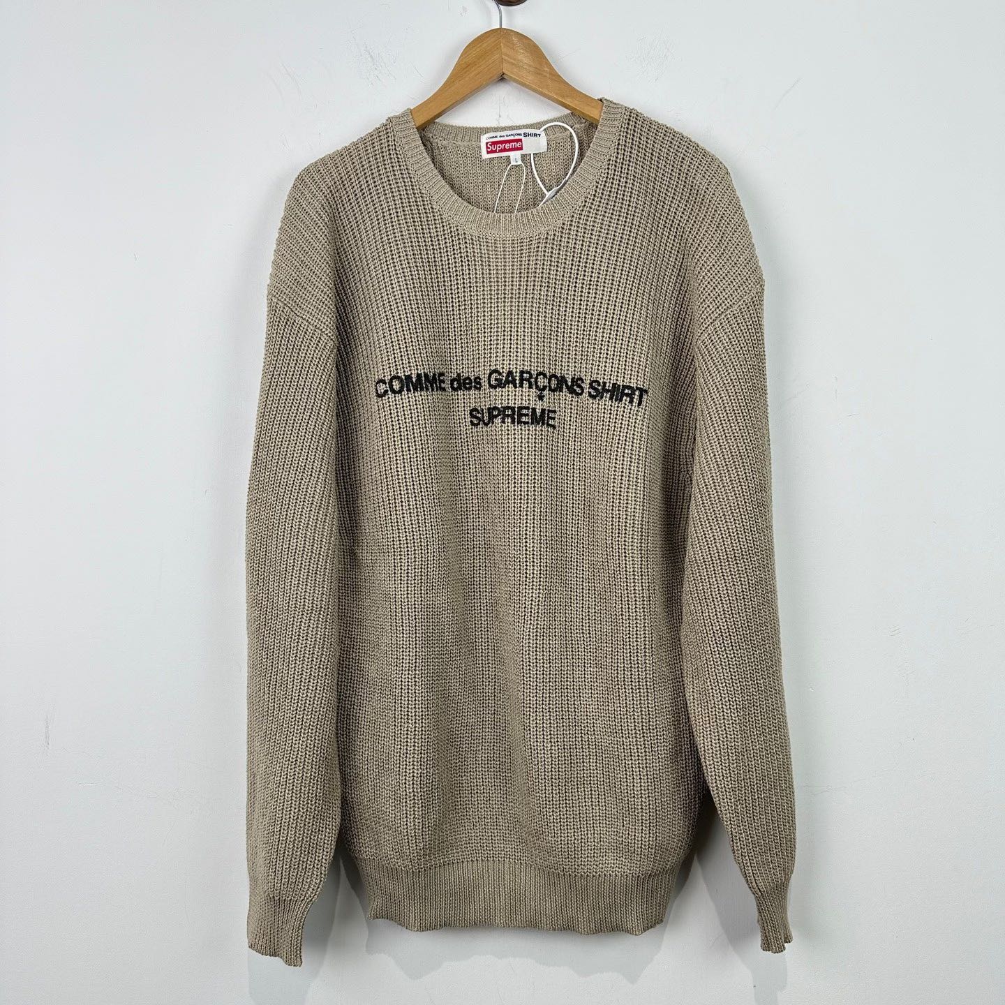Comme Des Garcons Supreme Tan Knit Sweater New product in excellent condition. Size L Authenticity guaranteed. Every item is 100% genuine, carefully inspected before shipping, and exactly as shown in the photos. Shipping and delivery. Orders are processed within 3-6 business days, then packed and shipped worldwide via DHL, UPS, USPS, FedEx. Order Cancellation & Returns. All sales are final. We do not accept cancellations or returns except in cases where the item is proven inauthentic or not as described. Enjoy the style, enjoy the experience, and thank you for shopping with Devines.