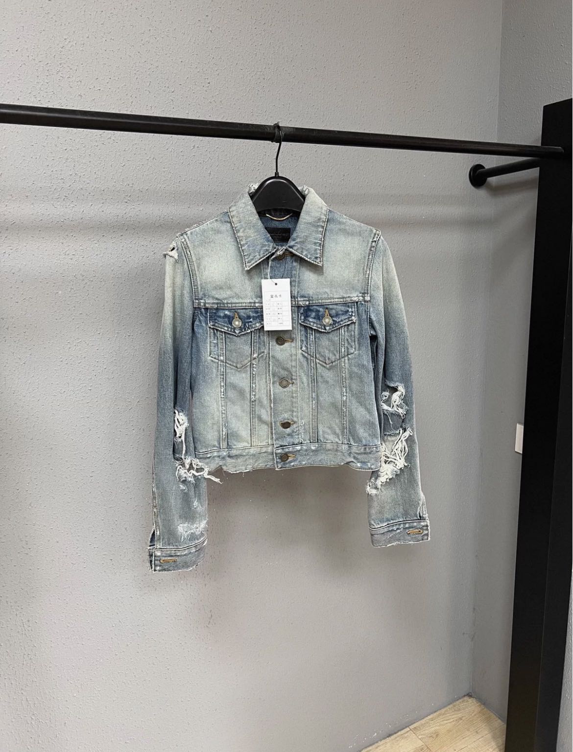 Saint Laurent Paris distressed denim jacket Great condition Size S Authenticity guaranteed. Every item is 100% genuine, carefully inspected, and exactly as shown in the photos. Extra inspection. Each item goes through a second inspection before shipping. Then we pack, ship and upload tracking. Shipping and delivery. Orders are processed within 3-6 business days, then packed and shipped worldwide via DHL, UPS, USPS, FedEx. Enjoy the style, enjoy the experience, and thank you for shopping with Devines.