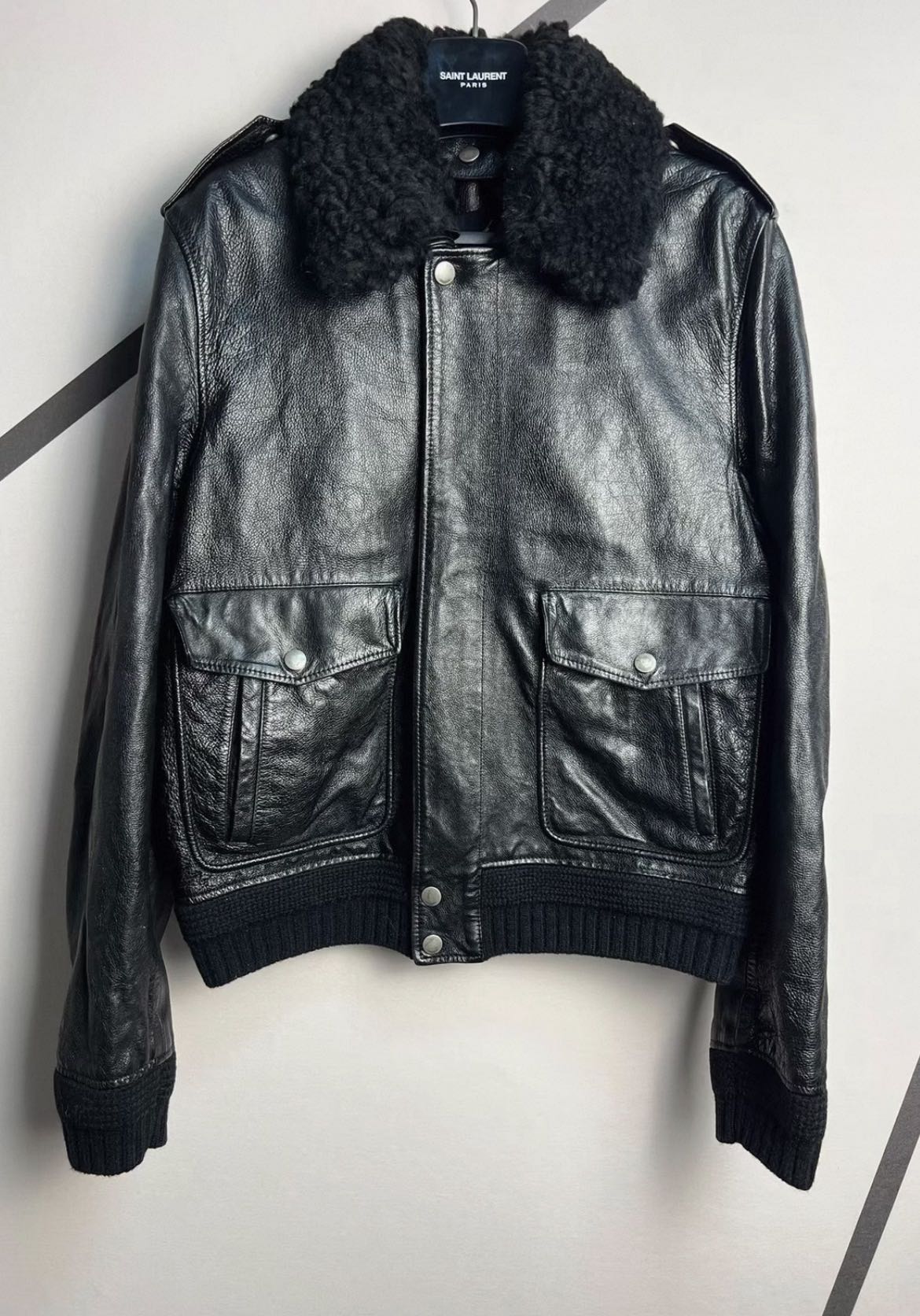 Saint Laurent SS17 Classic Black Leather Shearling Jacket In great condition with minimal signs of wear. Size 48 Authenticity guaranteed. Every item is 100% genuine, carefully inspected, and exactly as shown in the photos. Extra inspection. Each item goes through a second inspection before shipping. Then we pack, ship and upload tracking. Shipping and delivery. Orders are shipped within 6 to 10 business days. Shipping worldwide via DHL, UPS, USPS, FedEx. Enjoy the style, enjoy the experience, and thank you for shopping with Devines.