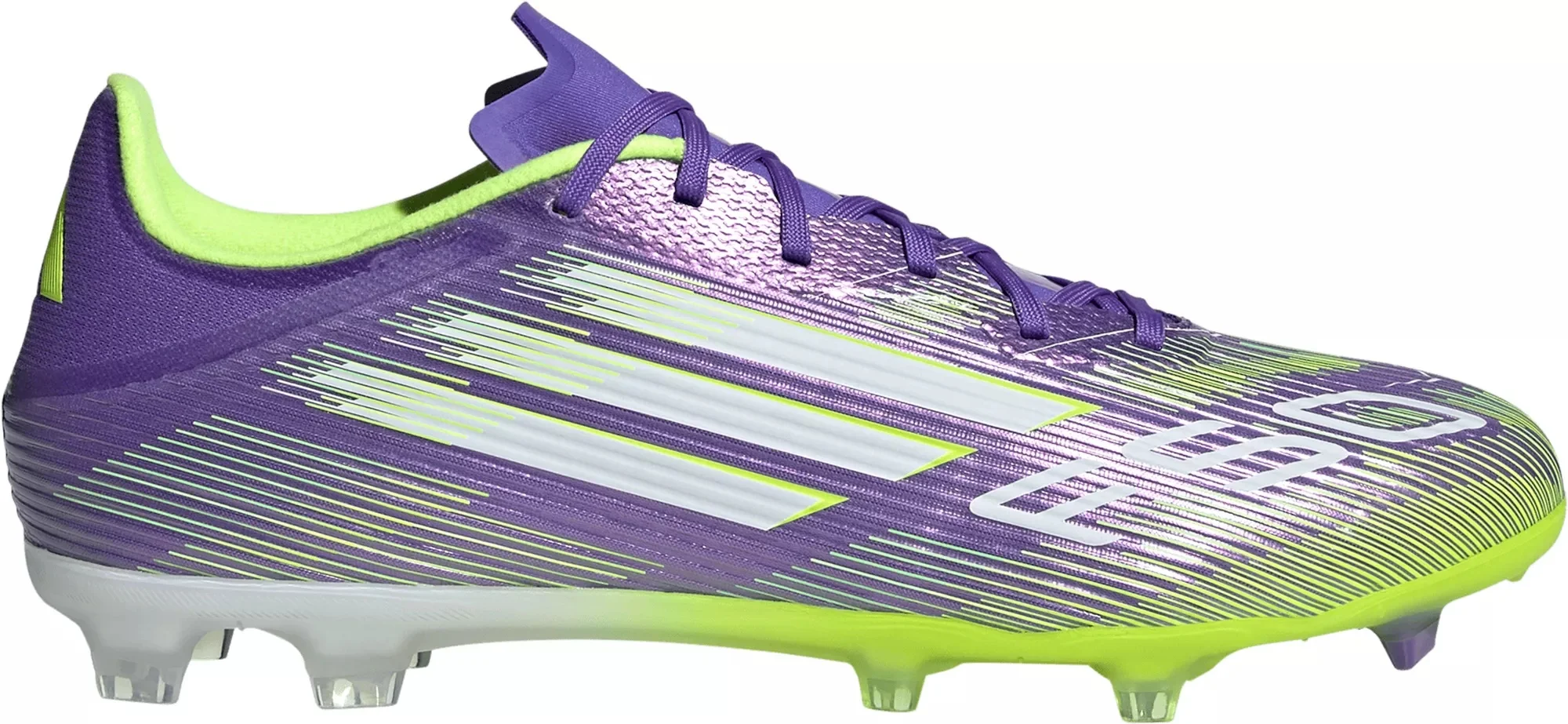 Design: Fiberskin upper for a lightweight feel and support Sticky mudguard layer for enhanced ball contact and dribbling Strategically placed 3d lines for fast visual and enhanced ball touch Stretchable tunnel tongue construction for improved fit experience and lockdown at high speeds Printed 3 stripes on both lateral and medial side of the midfoot, F50 logo printed on the rear side of the shoe Contains at least 20% recycled content Durability & Traction: Sprintplate 360 outsole with a combination of bladed and semi-conical studs for agility and speed in all directions Outsole and stud configuration are optimized for use on firm ground (dry natural grass)