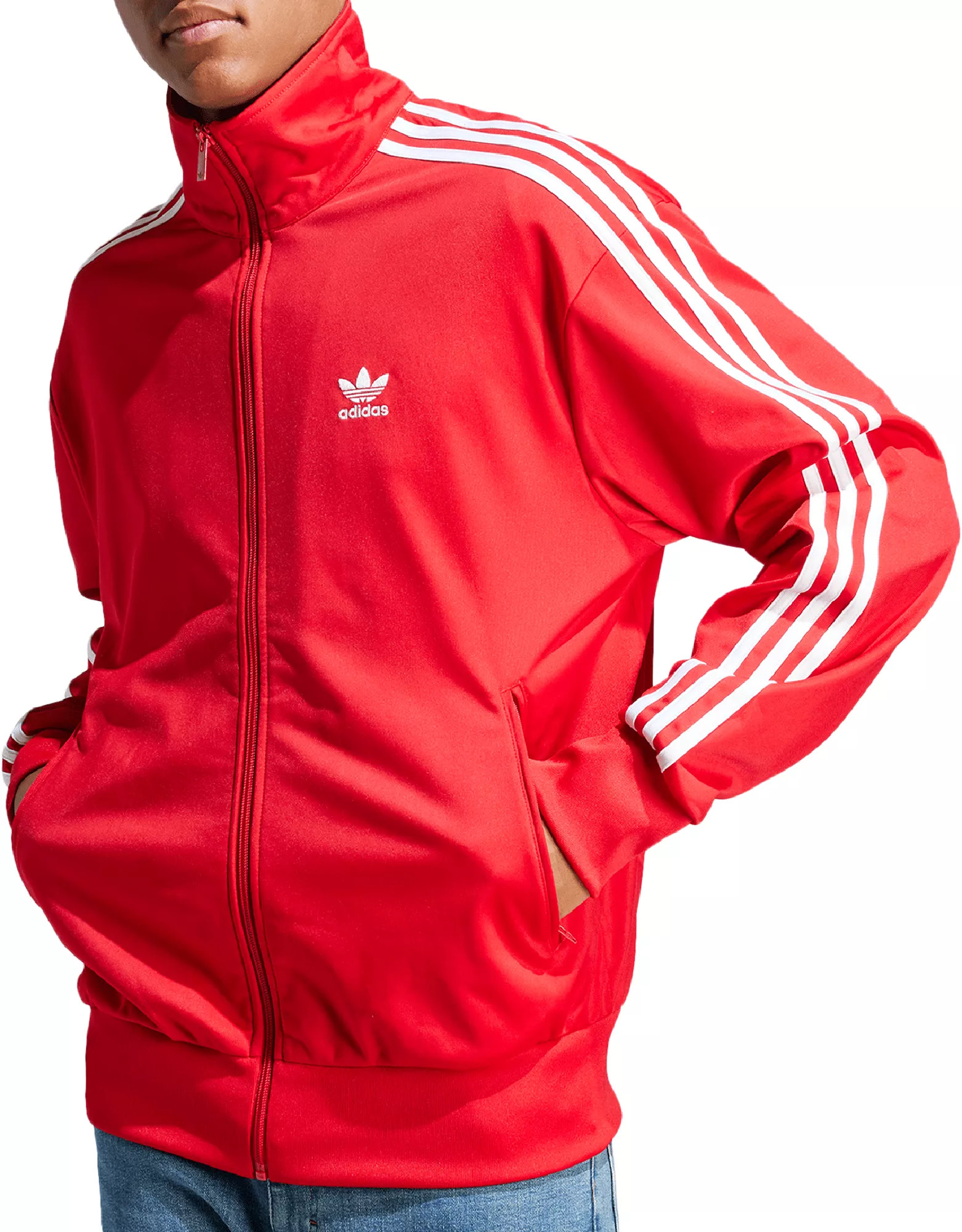 Fit & Design: Regular fit track jacket Tricot fabric has a smooth feel and signature sheen Stand-up collar lets you customize your fit Zip pockets allow you to tuck away the essentials Ribbed hem and cuffs help you stay cozy Embroidered Trefoil on the chest and 3-stripes down the arms add to your style Additional Details: A minimum of 70% of this product is a blend of recycled and renewable materials