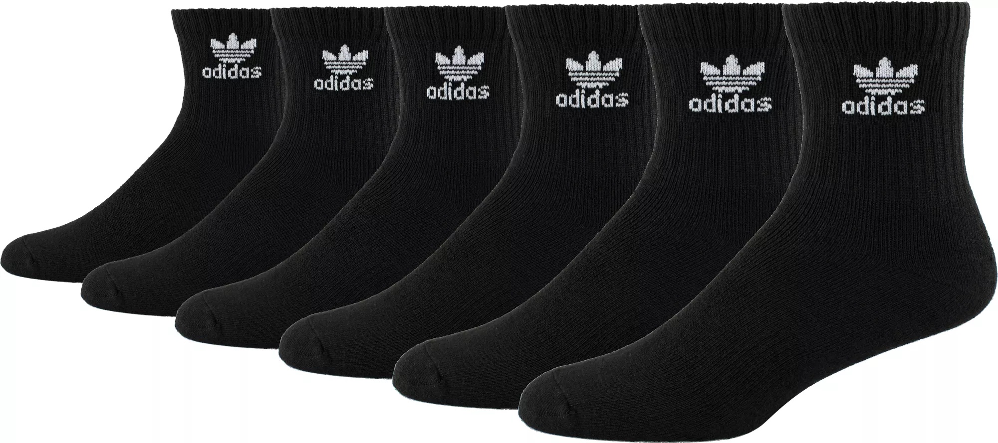 Freshen up your look with the throwback styling of the adidas® Men's Originals Trefoil Quarter Socks. The Original Trefoil socks are moisture-wicking, fashion-forward athletic socks that lend optimal comfort and style. Their arch compression lends a snug fit, while added cushioning keeps feet feeling fresh. Bring a laidback vibe to your wardrobe with the adidas® Men's Originals Trefoil Quarter Socks. FEATURES: Cushioned athletic quarter socks Moisture-wicking fabrics helps keep feet dry and cool Arch compression lens a snug, secure fit Cushioning adds comfort and durability SIZE CHART: Sock Size: Small= Shoe Size: Women’s 5.5-7.5 Sock Size: Medium = Shoe Size: Men’s 6.5-9, Women’s 8-10.5 Sock Size: Large = Shoe Size: Men’s 9.5-12, Women’s 10-12+ Sock Size: X Large = Shoe Size: Men’s 16-20