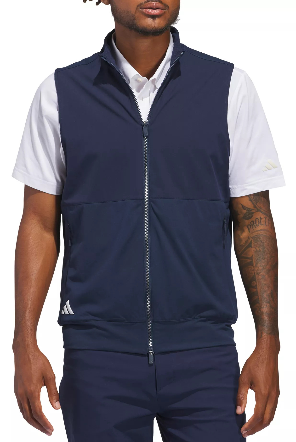 Don't let grey skies affect your game. This adidas golf vest provides a comfortable layer for cool rounds and it sheds occasional light showers to help you stay focused through the back nine. Soft, stretchy fabric offers tour-level performance. Fit & Design Designed to be a standard fit, not too tight or too loose Premium golf vest for on course performance Stand-up collar Centre front full zip Front zip pockets Performance logo on lower right Three stripe logo on center back Technology Water-repellent finish Additional Details This product is made with a blend of at least 70% recycled and renewable materials. By choosing recycled, we can reduce waste and remove our reliance on finite resources. Do not bleach Tumble dry low heat Wash inside out Do not iron decoration Wash with like colors Do not use fabric softener Wash with fasteners closed Remove promptly after wash Touch up with cool iron