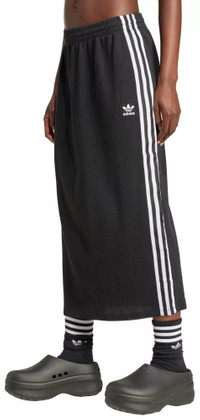 Move with confidence in this adidas skirt. The slim, doubleknit build provides a sleek silhouette that fits close to the contours of your body, following your every stride. Signature details give a subtle nod to their sporty heritage while elevating your look into fashion-forward terrain. Fit & Design: Slim fit Drawcord on elastic waist