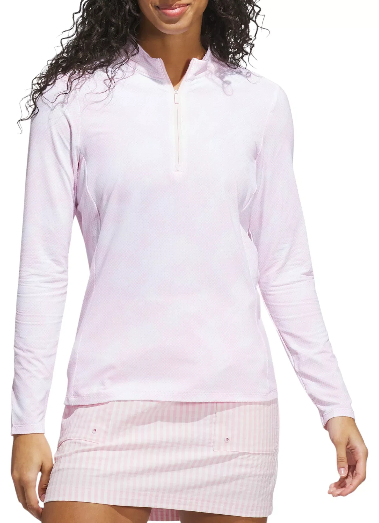 Cool days on the course call for versatile comfort that lets you focus on your swing. The soft stretch fabric of this adidas golf top moves with you as you twist and bend with every drive. A mock neck provides extra coverage for an elevated look that plays well on any course. Fit & Design: 1/4 zip is perfect for layering Mock neck Designed to be a standard fit, not too tight or too loose 4-way stretch for optimum comfort and maximum freedom of movement Cool touch material brings an instant cool feeling All-over print Technology: HEAT.RDY Additional Details: Made in part with recycled materials Machine wash cold, Tumble dry low heat