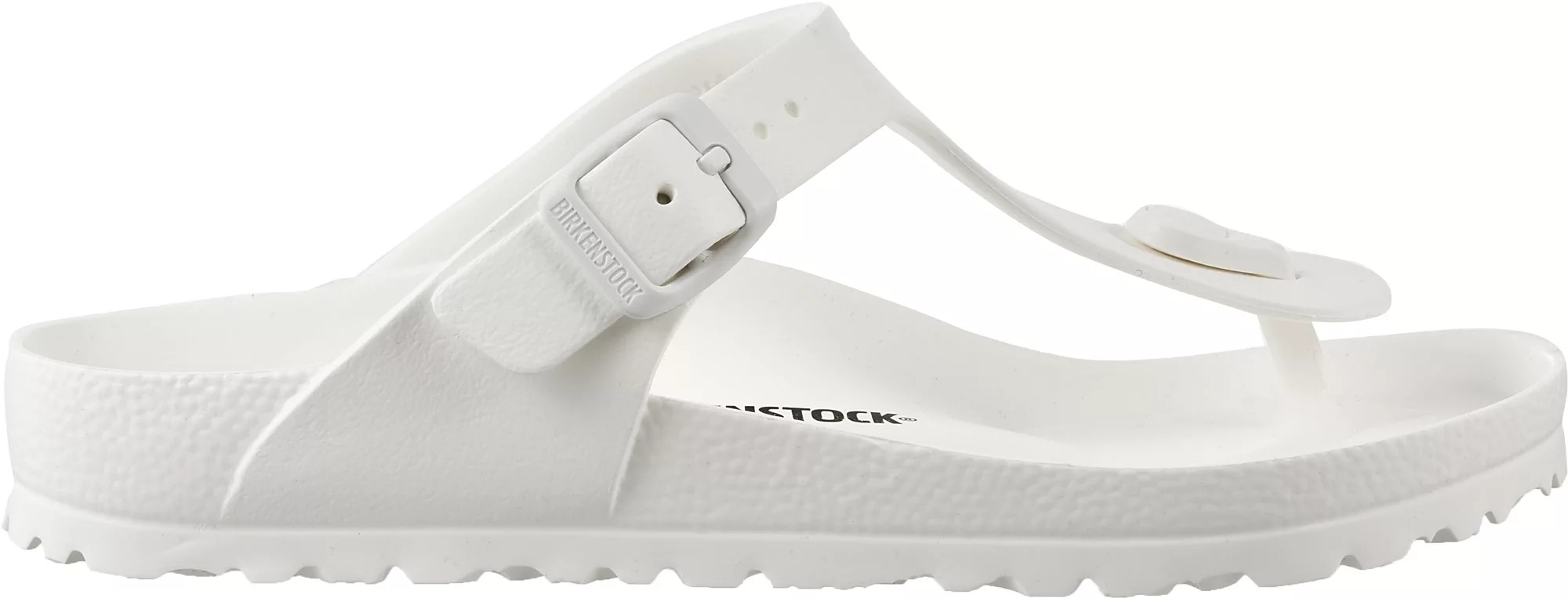 Slip into the easy-to-wear and always comfortable Birkenstock® Women's Gizeh Essentials EVA sandals. A water-friendly and versatile take on the classic Gizeh, this EVA version features contoured arch support, a supportive heel cup and a roomy toe box that lets feet breathe. Pair these women's slides around the pool, at the beach or while running errands for unbeatable comfort and style. SIZING TIP: The fit of this style is a medium width but may be listed by Birkenstock® as narrow. DESIGN: Flexible, lightweight, durable and shock absorbing EVA construction Sturdy toe post for a supportive fit Birkenstock®footbed offers arch support, a deep heel cup, and a roomy toe box Adjustable buckle for a custom fit ADDITIONAL DETAILS: Care instructions: Wipe clean with mild soap and water.